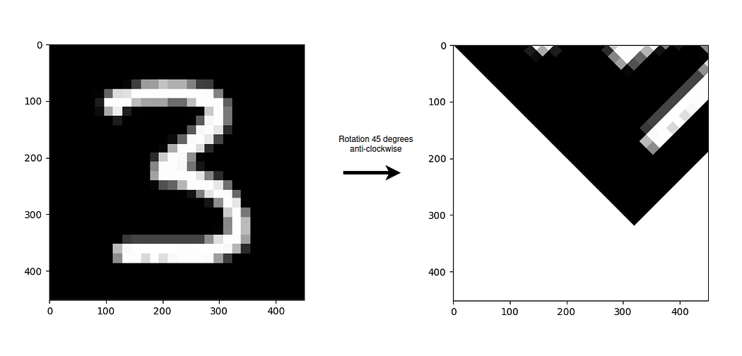 使用反向映射应用旋转变换的结果如下图所示,左侧为原始图像,右侧为变换后的图像。如前所述,图像围绕坐标原点(位于左上角)逆时针旋转。
