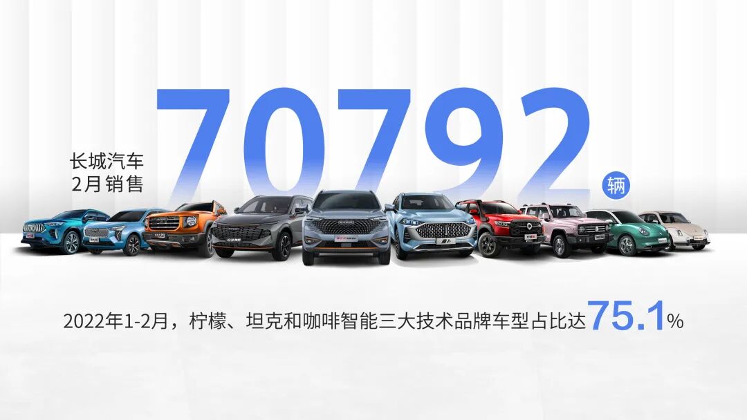 3月8日,长城汽车股份有限公司(股票代码:601633.SH,02333.HK;以下简称长城汽车)发布2022年2月产销数据。2月,长城汽车销售新车70,792辆,其中海外销售6,037辆。今年1-2月,长城汽车15万元以上车型销量占比提升至15.5%,智能化车型占比提升至88.1%,高价值、智能化产品已成为公司销售主力。柠檬、坦克和咖啡智能三大技术品牌自发布以来,不断激发产品新动能,基于三大技术品牌的车型占比持续提升,今年已达75.1%。接下来,长城汽车产品矩阵将持续焕新,坦克500、欧拉芭蕾猫、欧拉闪电猫、欧拉朋克猫等多款车型登场在即,激发企业发展新动能。