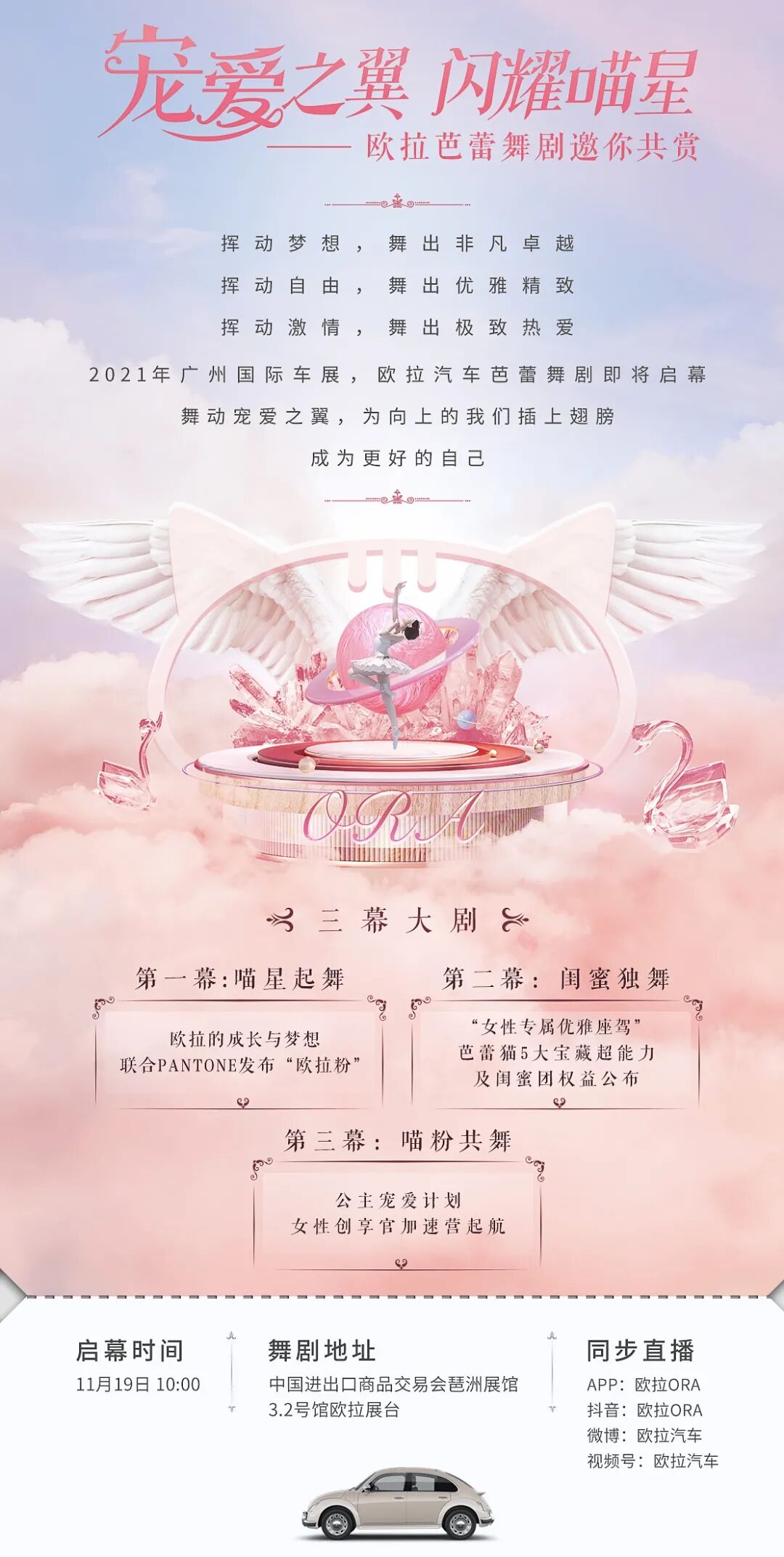 以梦想之名,见证喵星的蜕变。欧拉汽车芭蕾舞剧将在11月19日10时在广州车展启幕,并将在欧拉官方抖音(欧拉ORA)、官方APP(欧拉ORA)、官方视频号(欧拉汽车)、官方微博(欧拉汽车)等四大平台同步上演。舞动宠爱之翼,为向上的我们插上翅膀,敬请关注!
