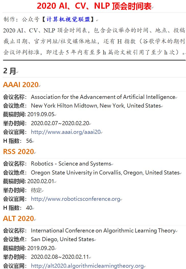 该公众号花费一周总结了2020年AI领域顶会时间表,包含截稿时间,举办时间等信息(PDF版本)!如有需要,添加文末联盟微信,回复2020AI获取!