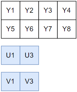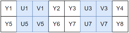 YUV 4:2:2 使用打包模式(Packed)存储,效果如下图(浅蓝色填充的每组 UV 分量,属于左右两个 Y 分量共用的采样):