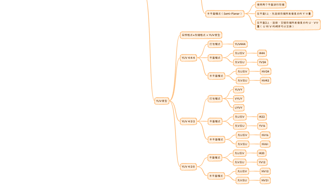比较特殊的是,我们现在要引入数组,来表示 YUV 的一种存储结构:平面(Plane)。我们使用一个数组表示一个存储 “平面” ,N个不同的数组即为 N 个平面。基于平面的概念,再按 YUV 存储时的各分量的排列顺序不同、使用的平面数量不同,我们可以将 YUV 存储格式分为三大类:打包模式(Packed)、平面模式(Planar)和 半平面模式(Semi-Planar)。