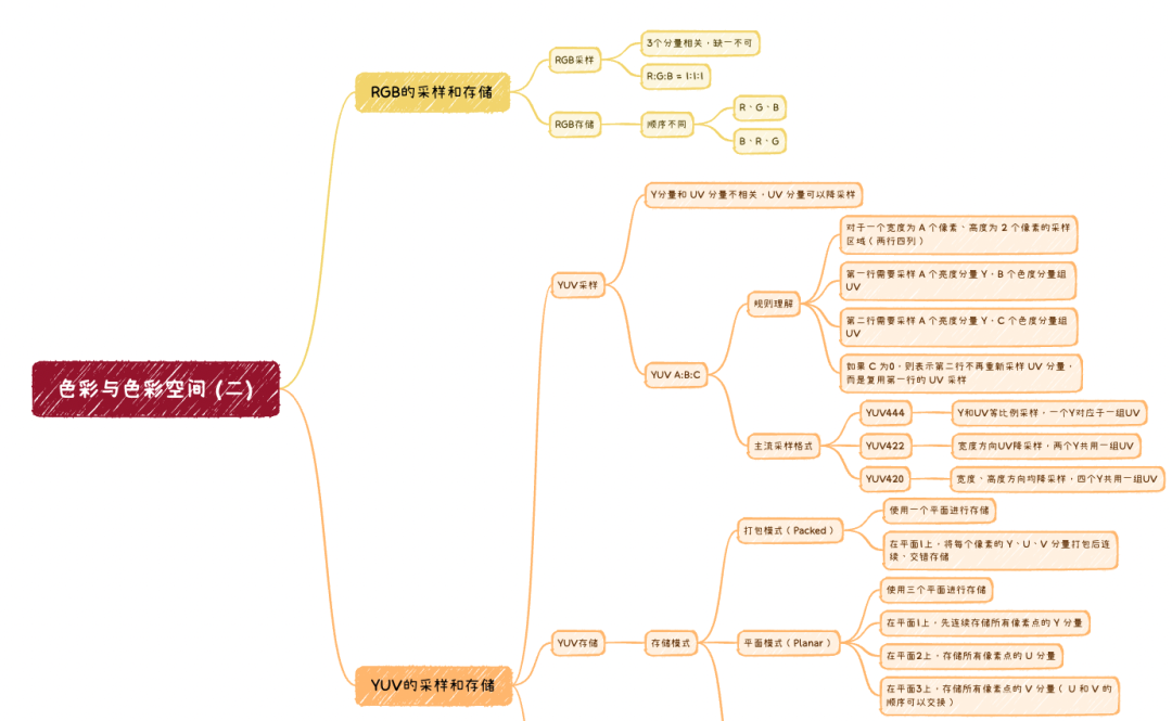 了解采样格式后,就需要考虑如何进行存储,YUV 的存储格式也有好几类,并且一种采样格式还可以选择不同的存储格式,不同采样格式搭配不同的存储格式,得到了不同的 YUV 类型,这些知识综合起来还是有一定理解和记忆难度的,大家跟着我的思路继续往下学习。