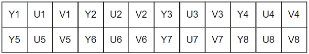 YUV 4:2:2 打包模式存储下,唯一平面为 8x2 的数组,每个 Packed 内部的顺序为 Y U V Y,并且遵循两个 Y 共用一组 UV 的特征,其得到的 YUV 格式为 YUVY(和 Packed 内顺序一致)。类似的,按照 Packed 内各分量顺序不同,还可以得到 YUV 类型 VYUY 和 UYVY。