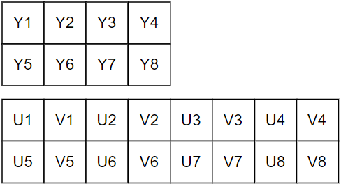 YUV 4:2:0 半平面模式存储下,两个平面分别为 4x2、4x1 的数组,第二个平面若按 U、V 顺序交错存储,则得到 YUV 类型 NV12。若按 V、U 顺序交错存储,则得到 YUV 类型 NV21。