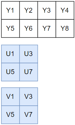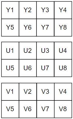 YUV 4:2:0 平面模式存储下,三个平面分别为 4x2、2x1、2x1 的数组,若后两个平面先存 U 后存 V ,则得到 YUV 类型 I420。若先存 V 后存 U ,则得到 YUV 类型 YV12。