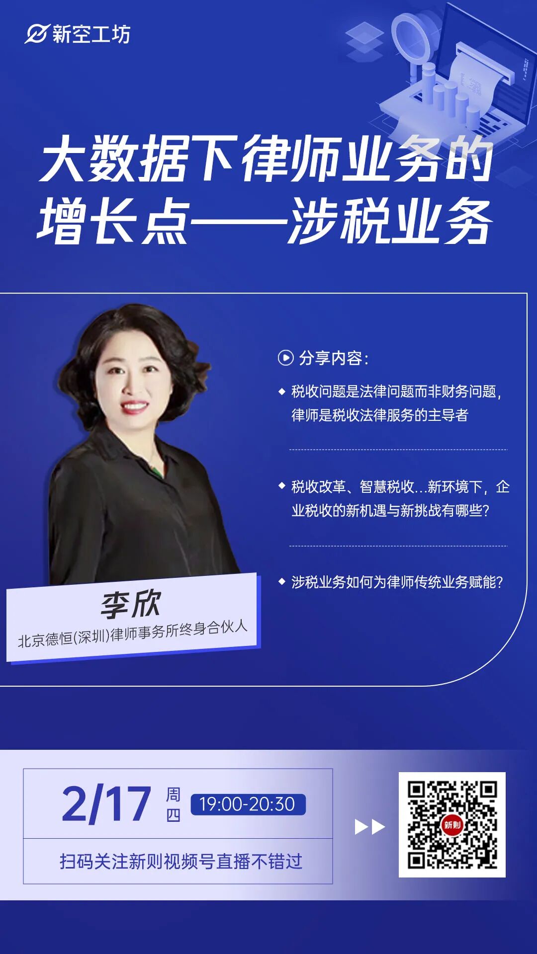 2月17日(周四)晚7点,新空小会邀请到北京德恒(深圳)律师事务所终身合伙人李欣律师,和我们分享“大数据下律师业务的增长点——涉税业务”,直播不可回放,欢迎扫码预约。