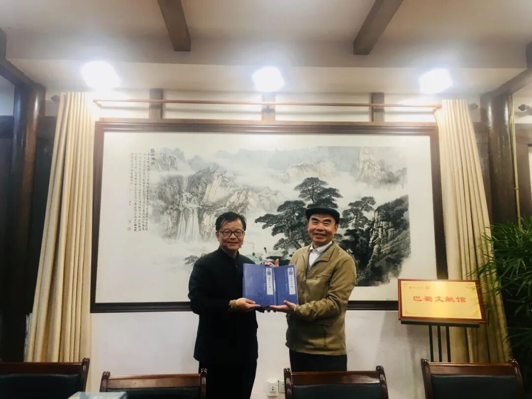 座谈中,舒教授首先欢迎杨德力先生一行造访,随后介绍了四川大学古籍整理研究所的概况、《儒藏》的编撰过程,以及杨升庵被列为巴蜀十大名人的过程。杨德力先生感谢舒教授的热情接待,介绍了自己二十余年来收集整理杨慎的历史资料,为传承与挖掘民族优秀传统家风文化走过的风雨历程,讲述了相关的“状元故事”以及杨氏宗祠的历史渊源。双方还交流了杨升庵与李时珍父亲的交往,探讨了杨、李二人是否有过交集的问题。座谈结束时,杨德力先生一行赠送四川大学古籍整理研究所杨慎“状元答卷”卷轴、“中华儒藏”书法作品,舒教授回赠了《儒学经典·康熙篆文六经四书》(上、下)与《全蜀艺文志》二种书籍。