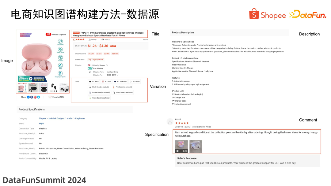 首先,让我们对齐一下信息源的名称。上图展示的是一个商品的详情页,其中包含了标题、图片、variation(也就是可以选择每个具体的 SKU 的部分)、结构化的商品详情,free-text 的商品描述,以及买家填写的评论信息。![]()