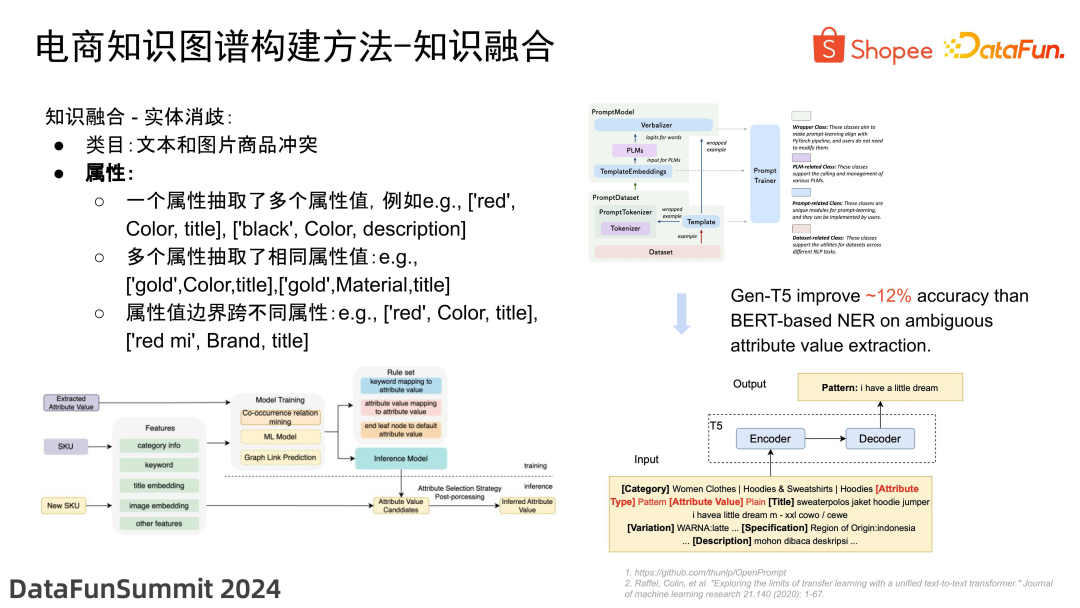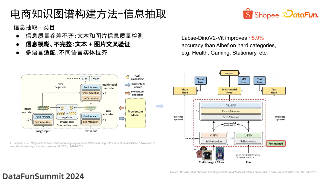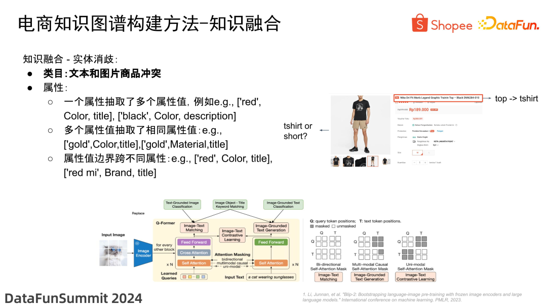 信息抽取后,下一步是知识融合,这里的难点是实体消歧。下面将结合类目和属性具体问题来介绍我们的解决方案。首先,对于类目而言,输入是文本和对应的图片,消歧问题体现在文本和图片信息之间的一些冲突。以上图右边的例子为例,商品图片质量是相对较高的,然而仅凭图片难以确定是在卖上衣、短裤还是整套服装,通过标题我们可以明确推断出是在售卖上衣。因此,我们结合文本和图像对齐的任务,训练了一些模型,其中一个典型的框架 Blip。我们借助这个框架,做了一些改进。然而,文本和图像对齐任务需要文本和图片的语义表达尽可能匹配,但在电商平台应用场景中并非总是如此。例如,在上一例子中,图片中只有上衣部分能与标题对齐,另一方面,标题中也会包含图片中未显示的信息,卖家通常会添加一些图片中无法表现的属性信息。因此,这些信息并不是完全对齐的。针对这一领域特定的问题,我们调整了模型,例如进行了文本引导的图像生成分类,以及图像引导的文本分类,因为它们并不是一个对称的关系。同时我们还加了对齐信息的约束,例如不希望发生颜色匹配但商品却不匹配的情况,因此限定了图片中的实体对象和文本中的关键商品词进行对齐匹配。![]()