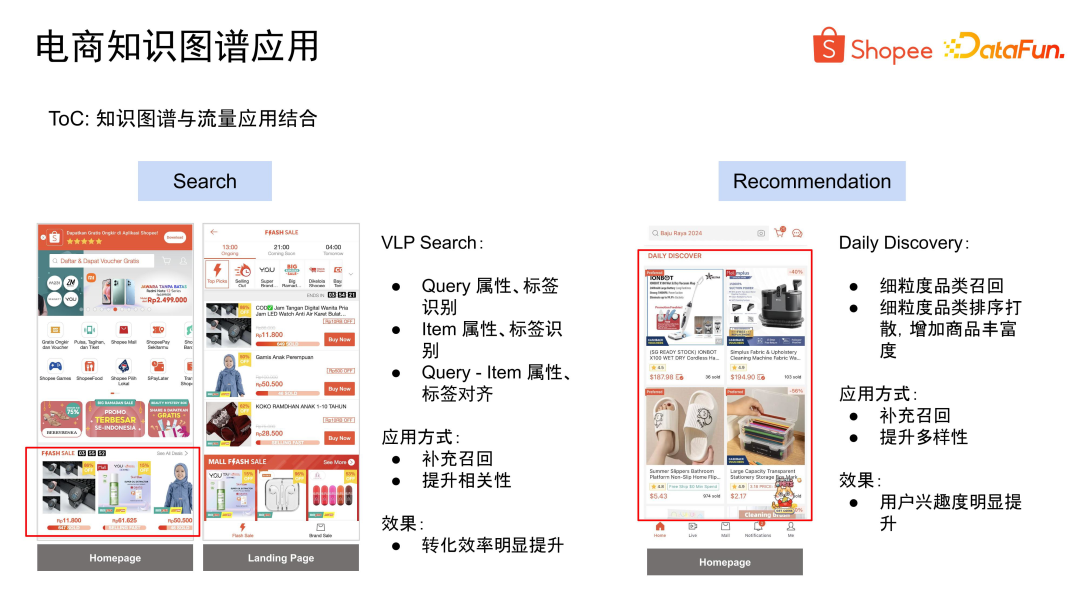 首先,知识图谱可以有效地与流量侧进行结合。在搜索场景中,以 VLP 场景为例,可以帮助处理查询,包括识别商品的特定属性和标签,然后将这些属性和标签直接注入到相应的索引系统中。当出现相关查询并解析出对应的属性和标签时,就可以进行高效的属性和标签对齐。通过这种方式,帮助搜索系统补充召回了大量相关数据,同时也提升了排序过程中的相关性。最终,转化效率也得到了显著提升。在推荐场景下,也有多种应用。以每日发现场景为例,在类别基础之上,我们提供了更细粒度的品类信息。可以在召回过程中补充细粒度品类召回,同时,在向用户展示商品时,将相邻商品的同品类信息进行打散,从而增加了用户看到信息的丰富度。我们发现用户的兴趣度明显提升,例如在 impression、点击率等指标中都有明显的改善。![]()