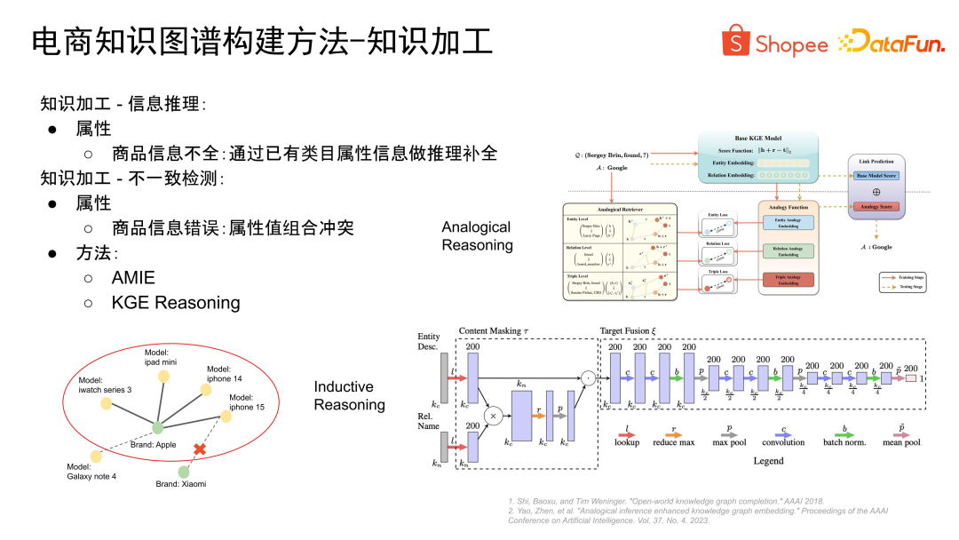 在知识加工这一步中,将着重讨论信息推理和不一致检测。这两个任务之所以被放在一起讨论,是因为它们其实是相互关联的。通过一些信息,我们可以进行推理,同时我们也可以反向利用推理结果来校验提取信息的准确性。如果存在冲突,那么很可能其中一个任务出现了错误,因此这两个任务可以进行双向校验。在这个任务中,仍以属性为例来介绍相应的方法。传统方法通常使用关联规则挖掘。例如,在左图例子中,我们看品牌和型号之间的关系,如果提取到一个商品型号是 iPhone 15,那我们可以反向推理出对应的品牌一定是苹果(Apple),这是一种单向推理。但如果我们已经知道一个商品的品牌是小米,而型号却是 iPhone 15,那显然这个关系是错误的,提取结果是错误的。除了传统方法外,我们还结合了知识图谱嵌入推理的方法。例如,通过归纳推理,可以给定一些头实体和它们的描述文本信息,然后预测它们与其他实体之间是否存在某种关系。通过这种方式可以进行信息的补全。最近,我们还发现了一些研究是类比推理,即进行平行关系的推演。类比推理可以基于已有节点之间关系形态,类比扩展到其他节点之间的相似关系结构。归纳推理和类比推理,都可以用于知识图谱补全。其中,归纳推理相当于从一个点出发,推理出不同方向的关系或连接的实体,可能存在于图中,也可能不存在。而类比推理则是进行平行关系的推演。它们适用于不同场景下的知识图谱补全。在电商领域中,我们经常面临信息不完整的情况,因此进行知识推理和补全尤为重要。电商知识图谱应用