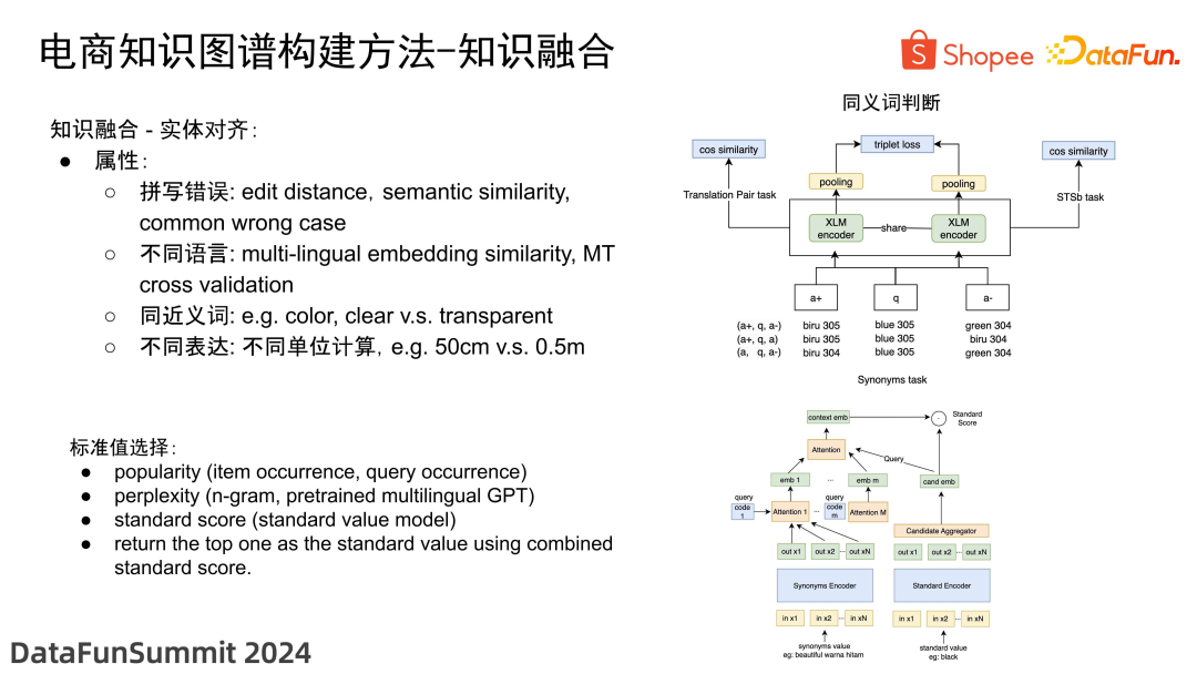知识融合的另一个难题是实体对齐。以属性为例,在实体对齐中涉及多种类型。我们的目标是对齐同一属性值的不同表达方式。对于拼写错误的问题,可以通过编辑距离、语义相似度、常见错误集合等方法处理。对于不同语言的问题,可以使用多语言嵌入相似度和模型翻译等方法解决。同义词和近义词的区分可能会有一些困难,因此我们借鉴了 Labse 模型框架,训练了一个同义词模型。重点区分词形相似但语义差别很大,以及不同词形但语义相近的情况。还有不同单位的情况。例如,一个人可能用"50cm",另一个人用"0.5m",我们针对这种情况进行了单位转换计算等处理。当对齐这些词后会发现同一属性词可能有很多选项。在众多选项中,我们需要选择一个标准词来代表相同的含义。选择标准词的标准有很多,比如流行度,即哪些词的使用频率最高。然而,流行度并不适用于所有场景。举例来说,在印尼市场中,错误拼写的使用最多,但错误拼写并不能在许多情况下准确表达商品的含义,因此我们还考虑了其他因素,如困惑度和标准表达能力,用来更准确的代表属性值集合。综合考虑这些因素,我们训练了一个模型,选择相应的标准值。![]()