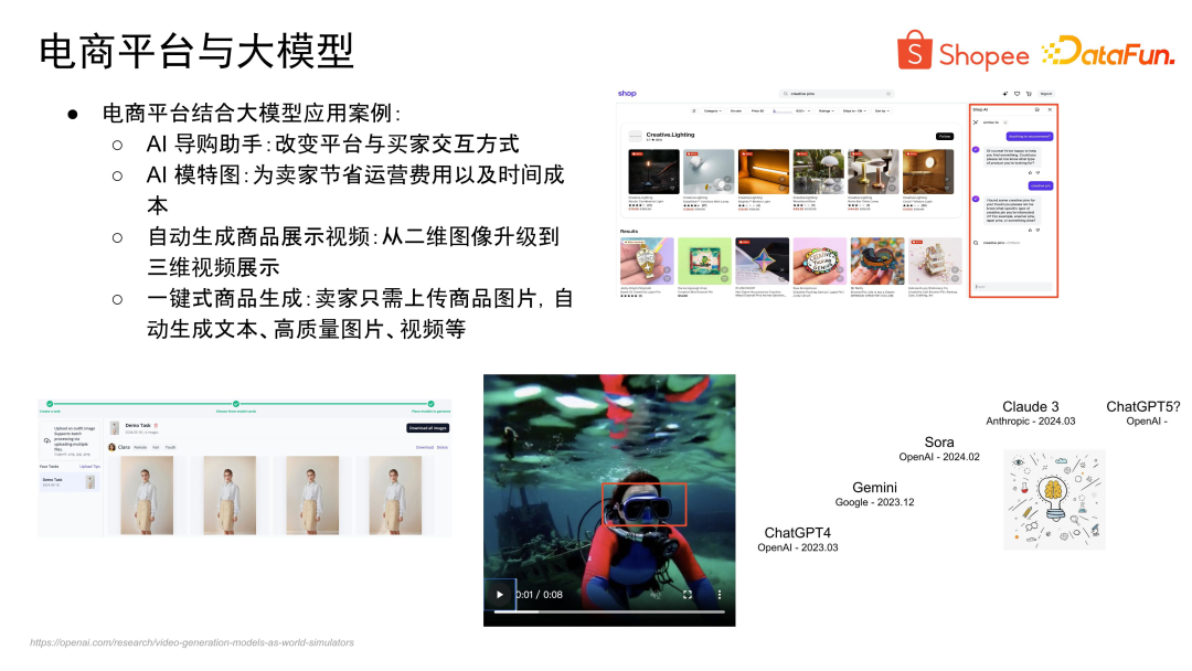 从整个电商平台的视角来看,也有很多与大型模型结合的成功应用案例。例如,最近许多平台都在尝试 AI 助手,最初是受搜索平台结合 AI 助手启发而来的,通过强大的搜索引擎和建模系统来改变平台和卖家之间的互动方式。当然,这需要经过一些实践验证,以确保符合用户的购物习惯,并根据反馈进行迭代更新。除此之外,还可以帮助卖家生成 AI 模特图,从而节省运营成本和时间。还可以通过二维图像,甚至文字描述,升级到三维视频展示,结合实际商品的应用场景,为卖家创造更直观的展示效果。近期,多模态大语言模型出现了爆发式增长,如 ChatGPT-4、Gemini、Sora、Claude 3 等,它们提供了强大的多模态大语言模型能力。这些模型的出现引发了对于未来是否能够实现一键式商品生成的讨论。尽管有许多声称是一键式商品生成,但实际上需要卖家进行大量手动输入。然而,如果这些模型能够应用到实际场景中,也许真的只需要卖家上传一张商品图片,就可以自动生成商品标题、描述、高质量图片,甚至视频等等。这些应用场景都具有很大的潜力。![]()