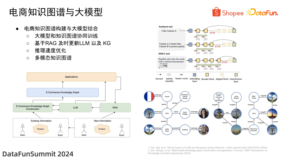 让我们进一步聚焦于电商领域中知识图谱与大型模型的结合方式。之前提到的三种结合方式在这里都是适用的。除此之外,在电商领域,信息的更新速度非常快,每天我们都会有数十万甚至上百万个新商品的注入和更新。在这种情况下,如何利用现有技术,例如 RAG,来帮助大型模型和知识图谱实现及时更新,同时及时响应实际应用场景,这也是值得研究的一个重点方向。在及时更新的过程中,我们又如何将实时发现的知识与已有的知识图谱进行融合和去重,并将其沉淀下来,作为未来的基础使用,这其中也有很多细节值得探讨。此外,推理速度的优化,也是一个老生常谈的问题,特别是在实际应用场景中,包括电商平台等,大型模型的推理速度往往会是一个很大的瓶颈。目前已经有很多加速的方式,例如量化、模型压缩等,在这不做过多展开。这里分享一篇有趣的研究。该研究并不是关注于使用什么技术来压缩模型或量化推理,而是通过应用层面的观察发现,针对不同任务,并不一定需要运行大型模型的所有层级,对于一些简单任务,可能只需跑完浅层的信息推理即可得出最终结论,而对于较难的任务再适配更多层模型信息。这为我们提供了一个新思路,在优化时可以考虑结合不同的应用场景进行选择性的适配。另外,多模态知识图谱也是一个方向。对于电商平台来说,所有信息源天然都是多模态的,包括文本、图片和视频等。我们可以尝试高效地将这些不同模态的信息源融合到知识图谱中,并将其整合到更多下游应用中。![]()