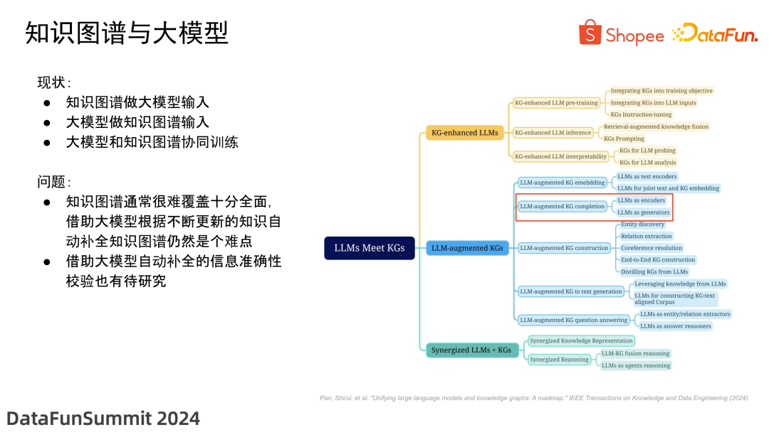 目前有三种主要的结合方式:第一种是将知识图谱作为大模型的输入;第二种是将大模型作为知识图谱的输入;第三种是双方进行协同训练。上图中展示的结构图来自一篇整理得非常清晰的调查报告,推荐大家阅读,这里不做赘述。仅分享一个有趣的发现,在整个知识梳理中,我们发现了一个比较薄弱的环节,即知识图谱的补全。尽管知识图谱补全的机制在理论上比较容易理解,例如归纳推理和类比推理,但在真实应用中相关工作和成功案例仍然比较少。在知识图谱构建中,一个重要问题是如何更全面地覆盖知识。如何借助大型模型根据不断更新的自然知识来补充知识图谱仍然是一个难题。此外,由于大型模型天然存在一些知识幻觉的问题,如何自动验证补充信息的准确性也是亟待研究的一个问题。![]()
