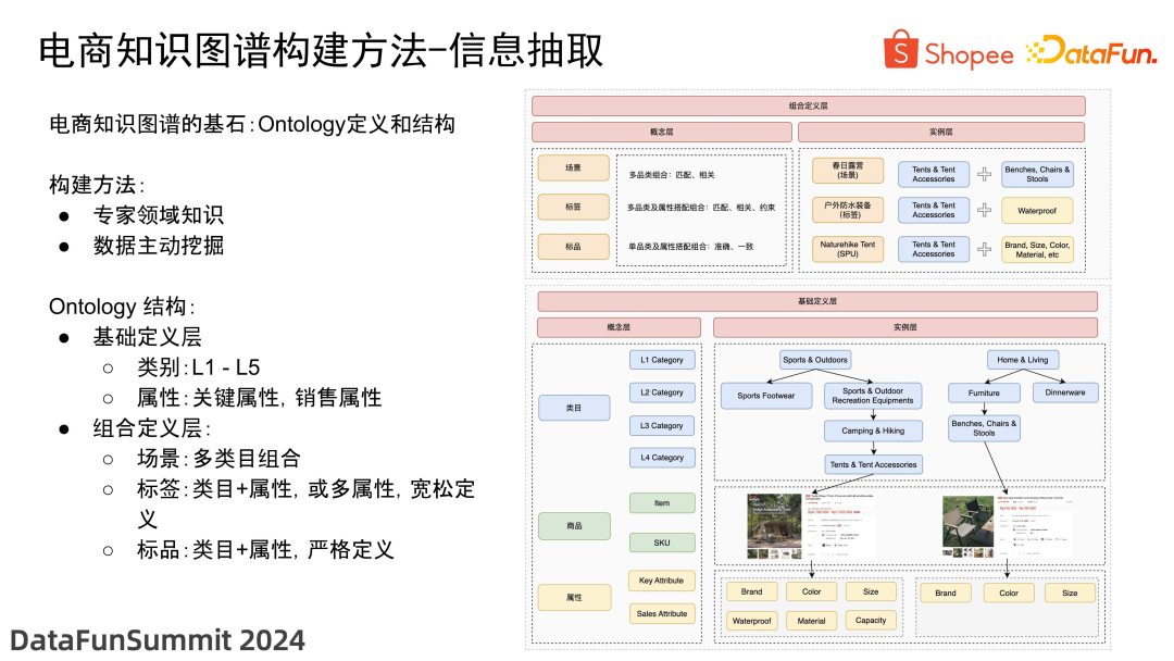 在进行信息抽取之前,我们想强调一点,对于电商平台来说,一个重要的基石就是进行 Ontology 的定义和结构化。为什么这么重要呢?因为商品信息非常丰富,我们并不需要抽取所有的信息内容,很多时候只需要抽取对我们的实际应用和业务诉求有影响的关键信息就足够了。构建方法基本上可以分为两大类:一是通过领域专家知识进行构建,二是通过数据进行主动挖掘。第一种方法需要大量人力,我们最近也在研究如何通过数据主动挖掘,发现一些未知的本体形式和结构。以 Shopee 为例,我们的 Ontology 结构主要分为两层:- 第一层是基础定义层,包括一些基础的元素,如类别和属性。类别又分为多个层级,从 L1 到 L5,属性也包括关键属性和销售属性,这些都与实际业务场景密切相关。