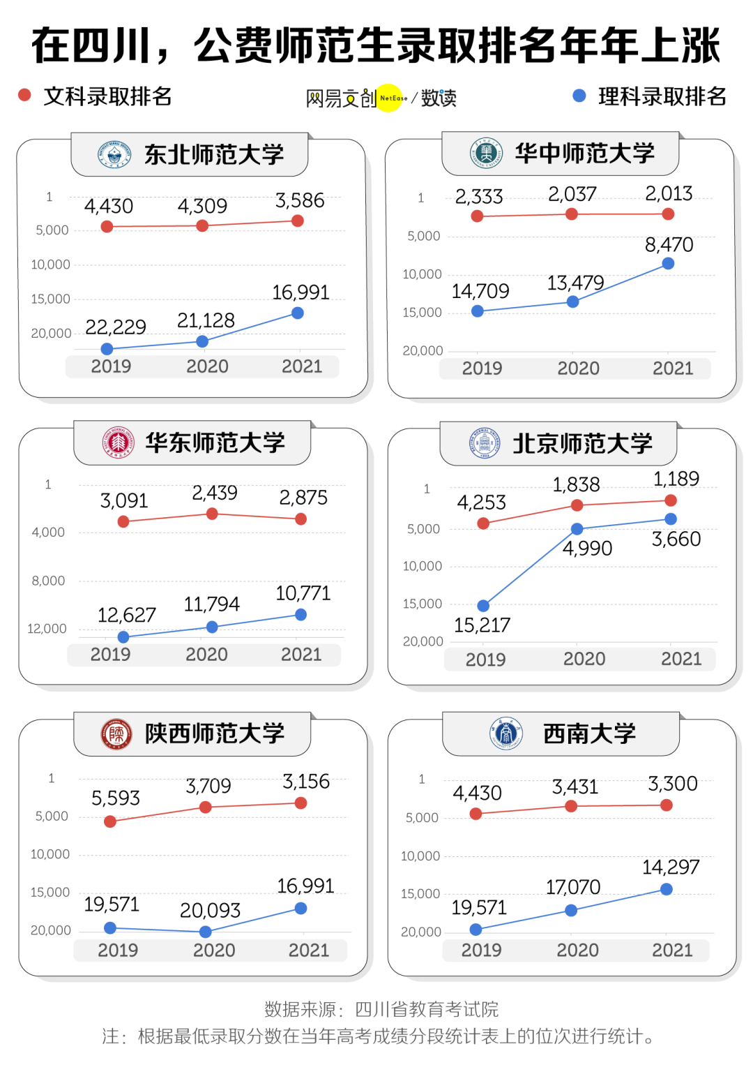 同样以四川为例,近三年来,六所师范大学的公费师范生录取名次都在接连上涨,其中理科甚至在以每年上千名的速度前进。
