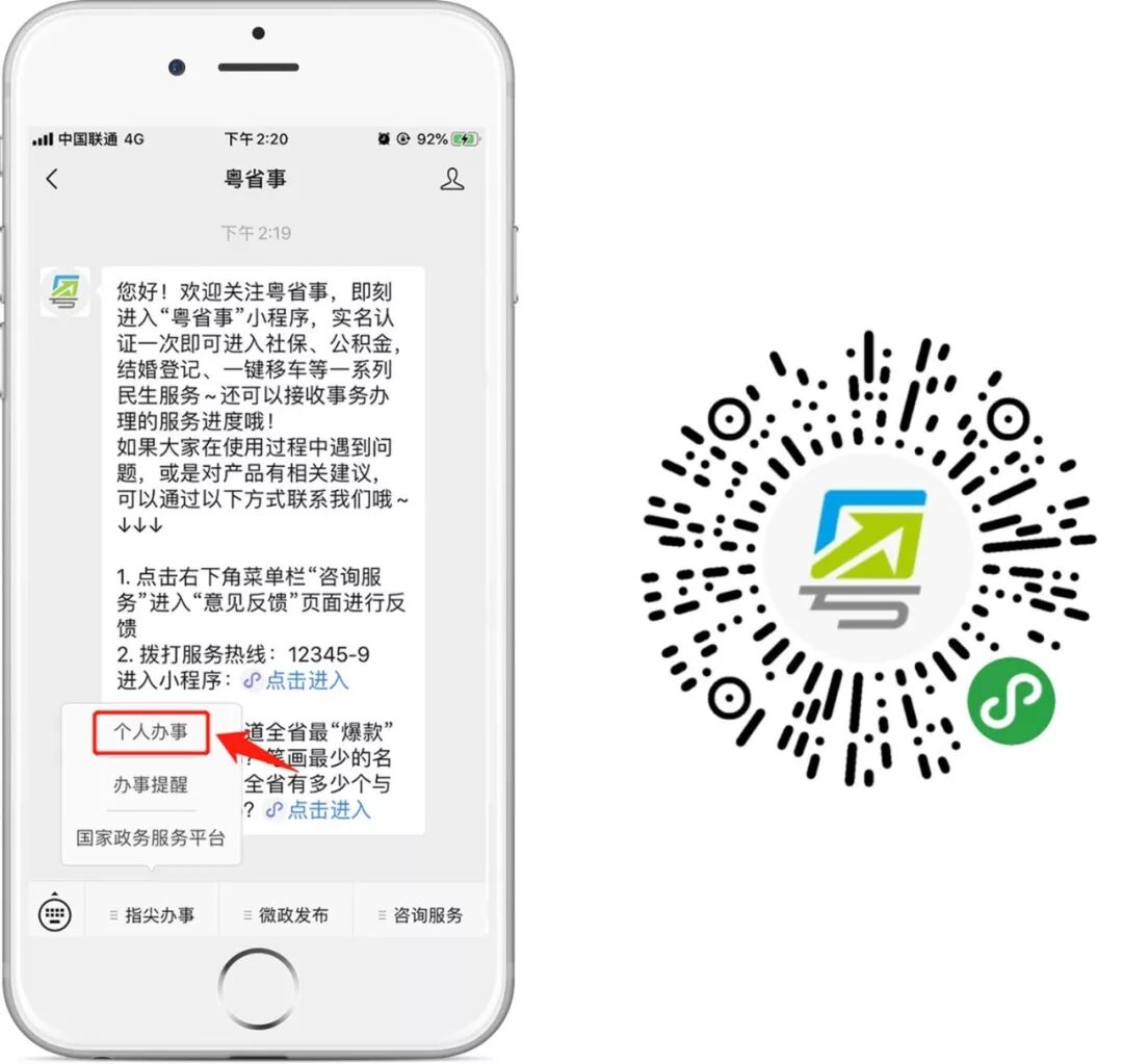 微信搜索并关注“粤省事”公众号,点击菜单栏“指尖办事”-“个人办事”进入“粤省事”小程序,或长按识别右侧葵花码进入小程序。
