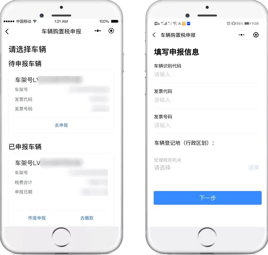 未进行申报车辆需先进行车辆购置税申报操作,选择待申报车辆,点击“去申报”,填写申报信息。
