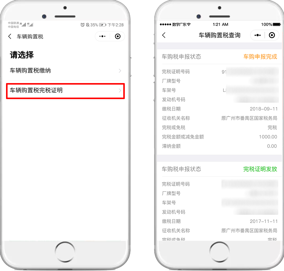 点击“车辆购置税完税证明”,可查询包括车辆购置税申报状态在内的车辆购置税完税证明信息。