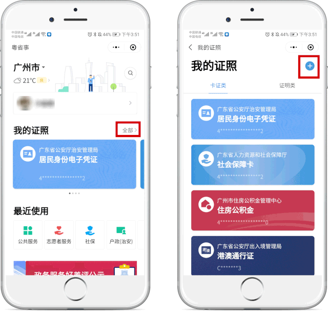或微信搜索“粤省事”小程序,登录小程序首页后,在“我的证照”右边点击“全部”,点击“+”,下滑找到“医保电子凭证”。