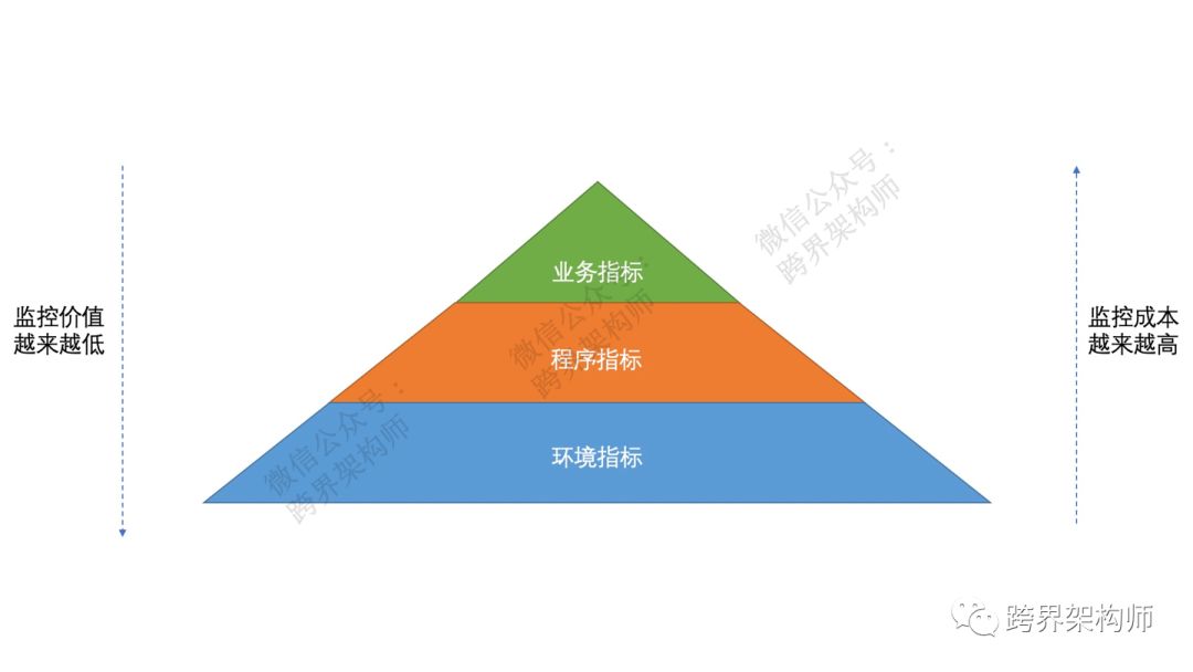 总体来看,这三层指标恰好构成一个金字塔结构。从监控价值来看 业务指标 > 程序指标 > 环境指标。从实施的一个成本来看,也是 业务指标 > 程序指标 > 环境指标。