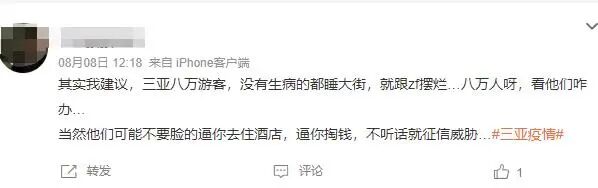 然而事情的走向也越来越烈,逐渐从“国难财”发展到有人认为三亚就是趁着旅游旺季搞疫情封城来“强制旅客消费”。
