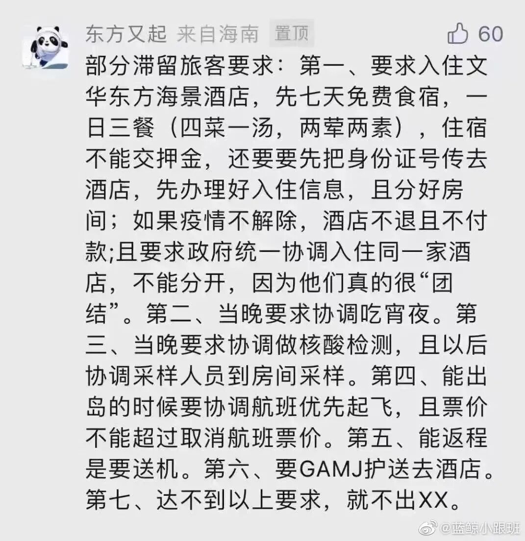 更有网友晒出了部分滞留旅客的无理要求,不仅要入驻高级酒店,食宿全免,晚上还要吃宵夜;