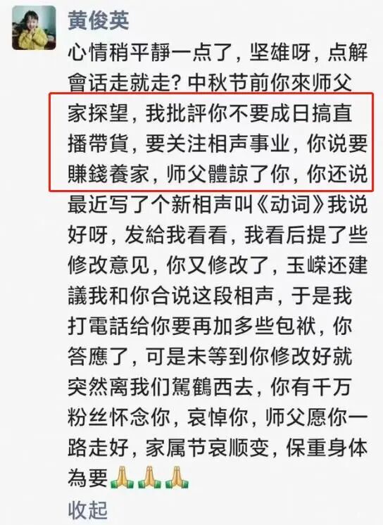 陈坚雄的师傅,南派相声泰斗黄俊英的朋友圈就表示,当时劝他多点关注相声发展,少点在直播带货上劳碌。