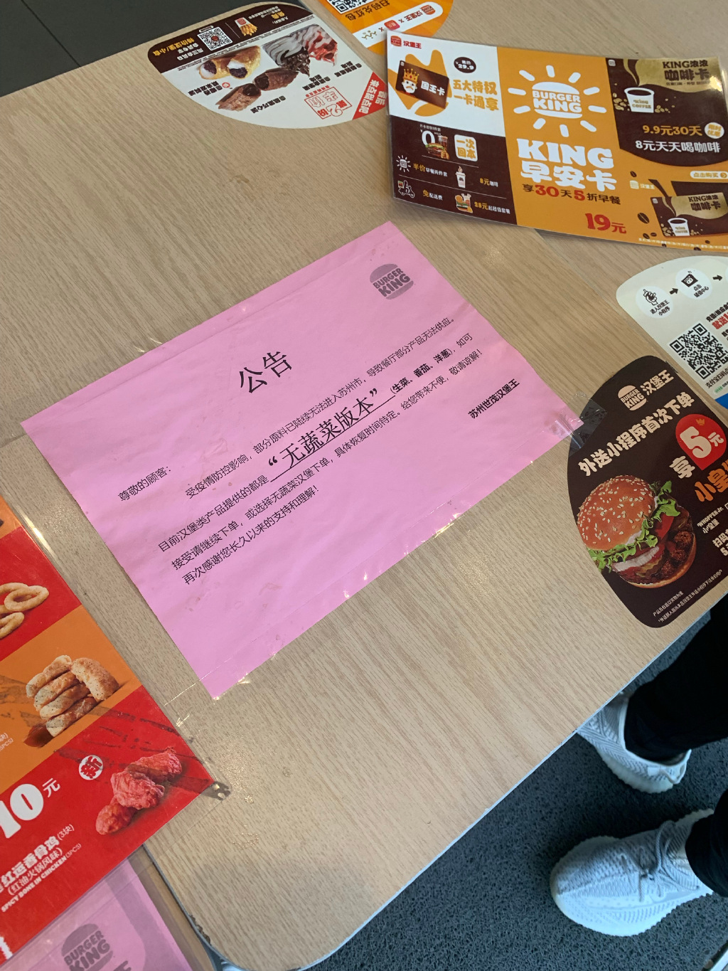 由于疫情管控,很多餐厅的食品原料开始短缺,当地的某家汉堡王,还推出了无蔬菜版本。