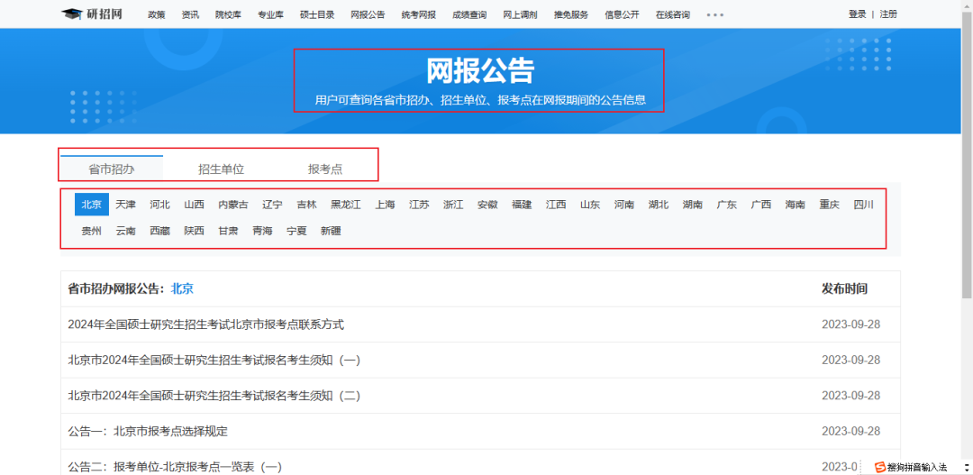 研招网(https://yz.chsi.com.cn)也可以浏览相应的公告信息,点击“网报公告”板块,按照省市招办、招生单位和报考点几方面进行查询。