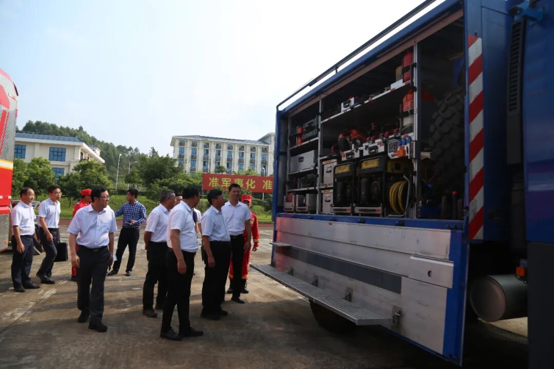 在装备展示区中,还展出了全地形地震救援车,内置破拆、顶升、照明、侦测、通信、搜救、防护等上百件工器具,工作组驻足观看了车载工器具的演示,现场救援队员展示了圆盘切割锯灯泡上切钢丝、液压剪切钳夹鸡蛋等精准操控技术,救援队员扎实的战斗作风和过硬的能力素质得到了调研组高度肯定。