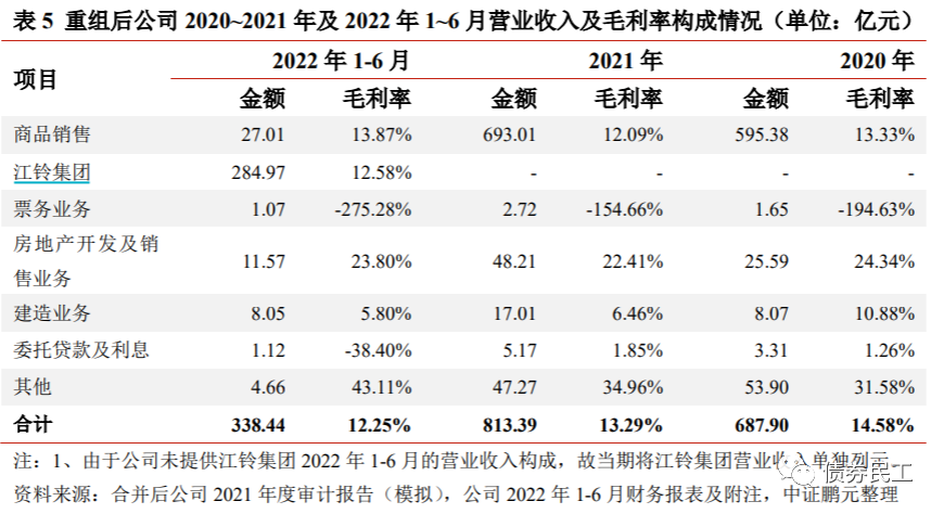 根据本次评级报告的信息,本次资产重组南昌交投集团主要是并入了南昌轨道集团和国控汽车集团(主要子公司为江铃汽车集团)。根据模拟报表数据,商品销售业务主要是新增整车及零部件销售和金属贸易业务,主要是来自于江铃集团。![]()