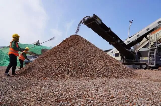 在建筑垃圾存储区,记者看到,堆积如小山般的建筑垃圾旁,一套移动筛分破碎机正在作业,运转中的机器发出巨大的轰鸣声。砖石、水泥块等建筑垃圾经过传送带被送入分拣区域,剔除了冗余土和轻质物后,碎砖、石块等进入破碎环节。