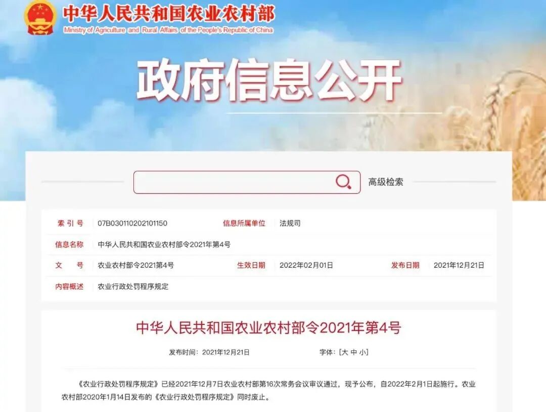 为贯彻落实新修订的《行政处罚法》,进一步完善农业行政处罚程序,推进严格规范公正文明执法,2021年12月7日,农业农村部修订发布《农业行政处罚程序规定》,将于2022年2月1日起正式实施。农业农村部2020年1月14日发布的《农业行政处罚程序规定》同时废止。