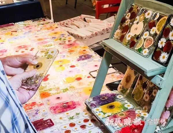 去年我就在第一百货开的六合路小尖顶市集摆摊了,但是感觉这次的生意更好。因为大家憋了这么久,肯定想要买点美美的东西。我们这里的手机壳都是用真正的鲜花、水果制作的,特别适合即将到来的夏天。你看我拖来的两个行李箱,本来里面都是手机壳,现在只剩下包装袋了。