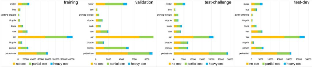 图3:DET track中训练集、验证集、测试挑战集和测试开发集中不同对象类别不同遮挡度的目标数量。