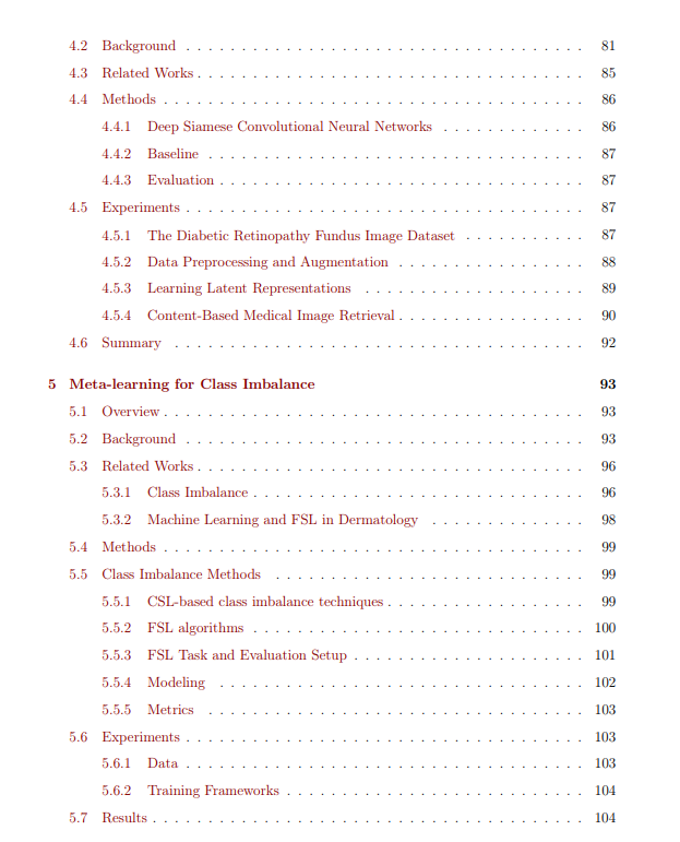 接下来,我们放大数据不平衡问题。本文探索了对比学习的用途,特别是孪生网络,从不平衡的眼底成像数据集中学习表示,用于糖尿病视网膜病变图像检索。与标准的监督学习设置相比,我们使用从Siamese网络学习的表示获得了可比较但可解释的结果。我们还利用极不平衡的长尾皮肤图像数据集进行皮肤病分类的元学习。我们发现,使用元学习模型和使用常规类不平衡技术训练的模型集成可以产生更好的预测性能,特别是对于罕见的皮肤病。