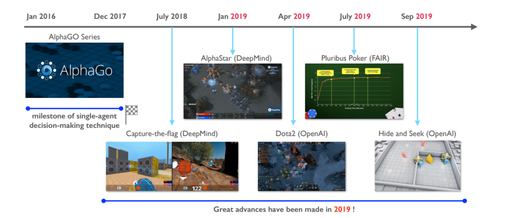 AlphaGo系列的成功标志着单agent决策过程的成熟。2019年是MARL技术蓬勃发展的一年;在解决极具挑战性的多人实战策略电子游戏和多人不完全信息扑克游戏方面取得了显著进展。
