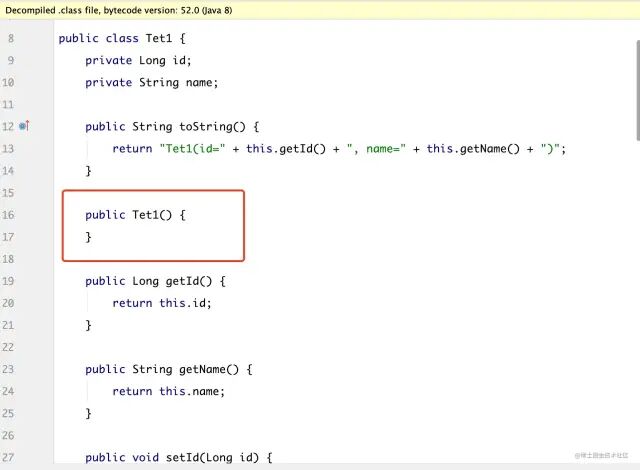 编译后的class为:可以看到不仅帮我们生成了get和set ,同时也有默认的无参构造器