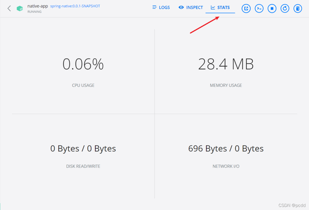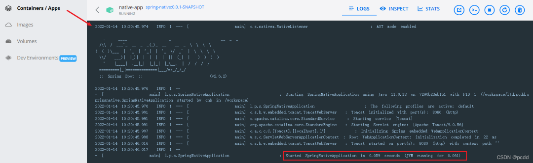 在Docker Desktop查看日志,发现应用成功启动,启动仅耗时0.059s,也就是59ms,果然印证了Spring Native启动是毫秒级别这句话。
