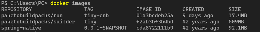 因为每个微服务使用Docker部署而不是exe文件,所以方法1正好符合我的需求,所以后文使用Spring Boot Buildpacks的方式构建Spring Boot原生应用程序。