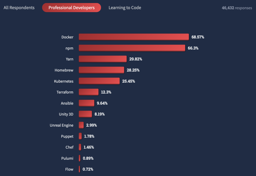 2、去年,Git还是大家最常用的基础工具,完全碾压其后的Docker、Yarn等。今年Docker已取代Git夺得第一,使用率从55%增长到69%。