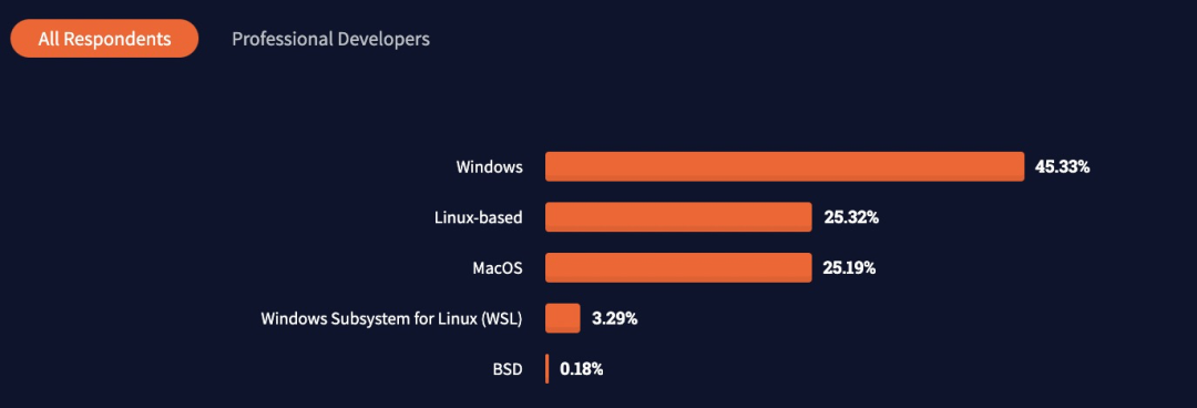 更多详情:https://survey.stackoverflow.co/2022/#section-most-popular-technologies-operating-system。