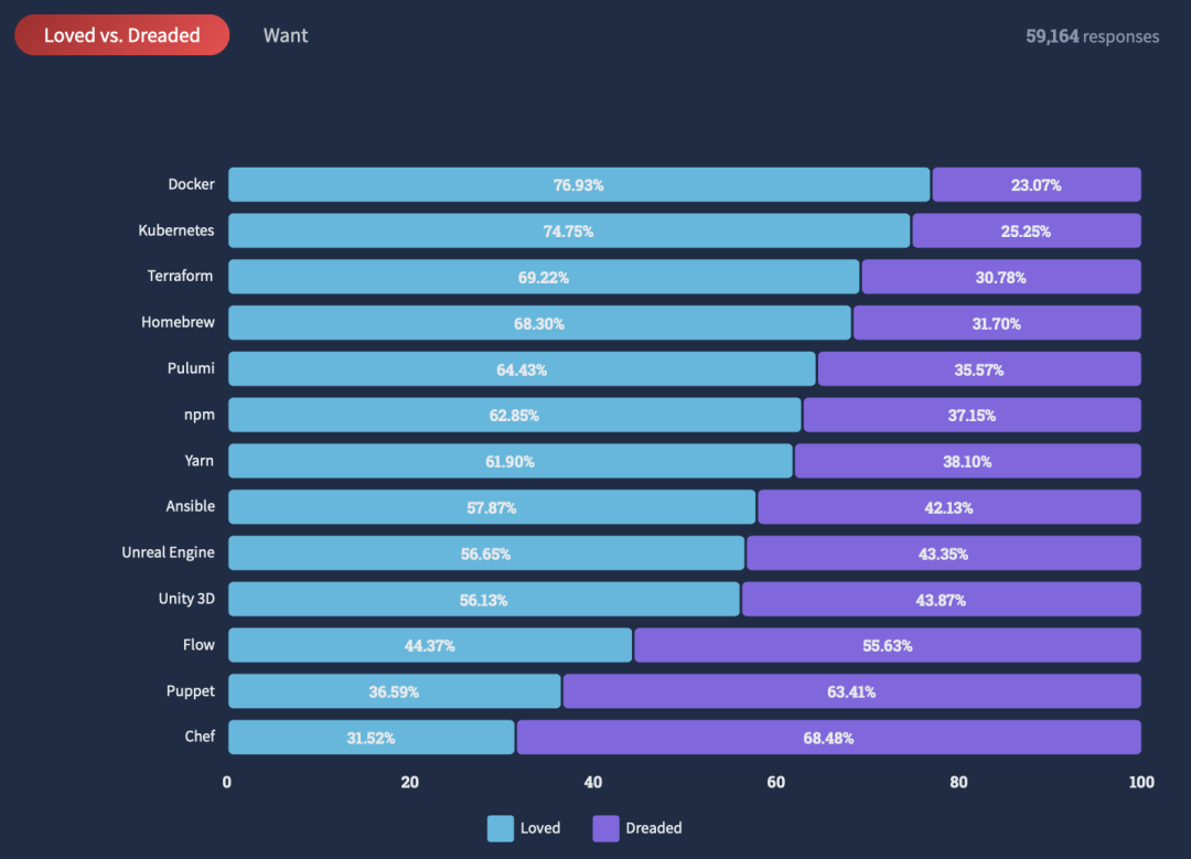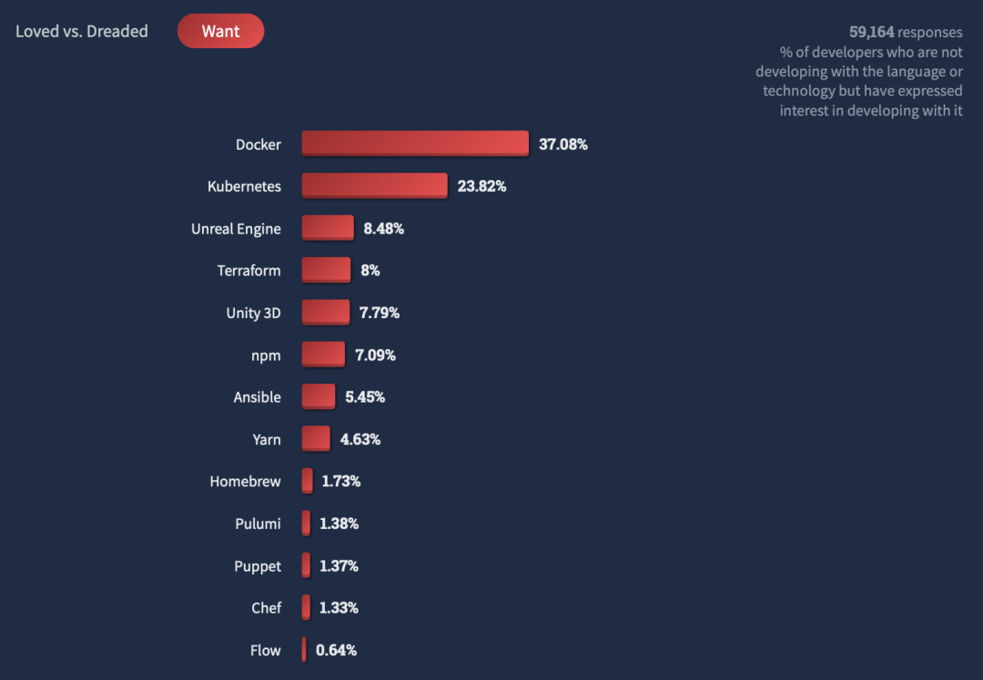 3、Docker和Kubernetes分别位列最受喜爱和想要学习的工具第一和第二位。随着Docker的数据从去年的30%增加到今年的37%,可以看出大家想要使用Docker的愿望并没有放缓。