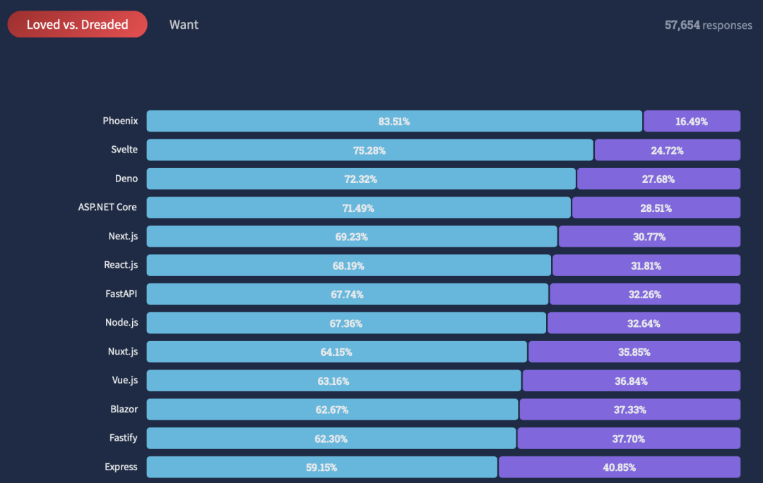 4、Phoenix取代Svelte成为最受欢迎的Web框架。Angular.js连续三年成为开发者最讨厌的框架,React.js连续五年成为开发者最想学习的框架。