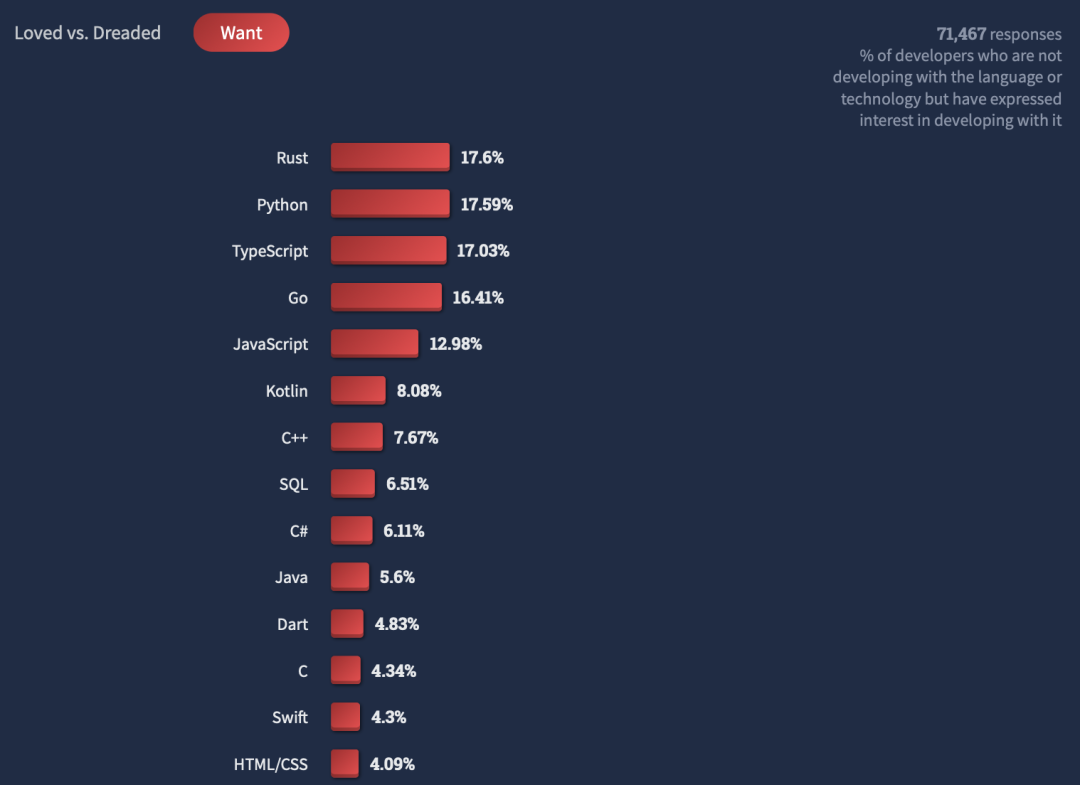 同时,它与Python、TypeScript一起成为最想学习的前三大新语言。