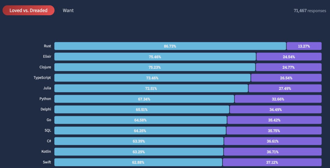 1、编程语言方面,Rust已连续第七年成为最受喜爱的语言,约87%的开发人员表示他们希望继续使用它。