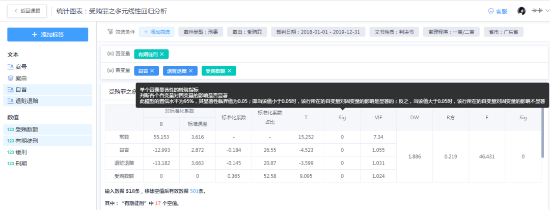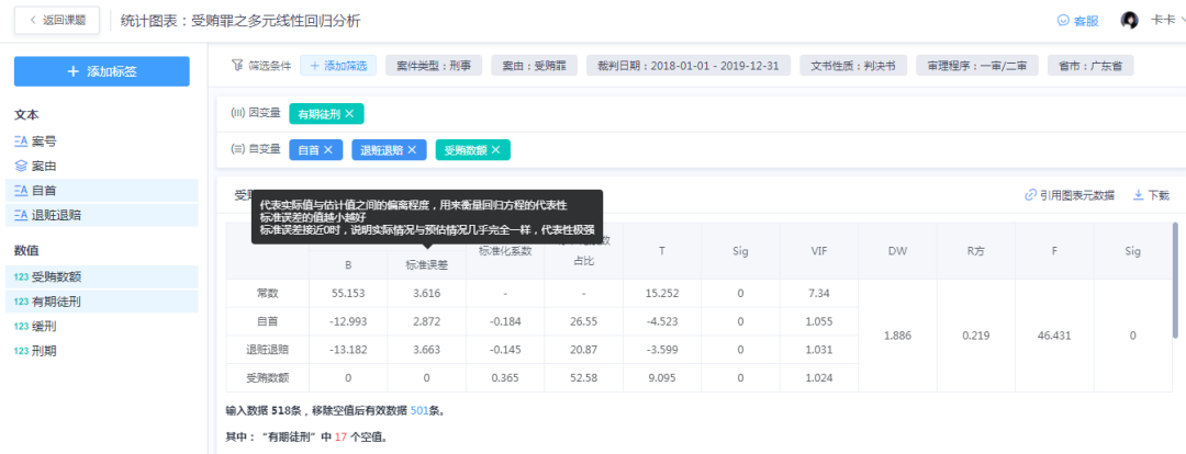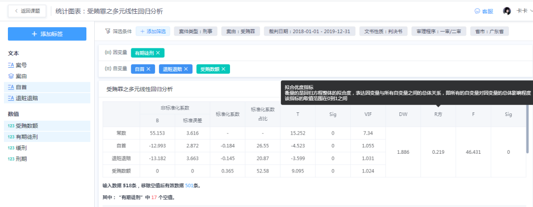 第一步:确定自己的自变量和因变量标签,如:确定“有期徒刑”为因变量,确定“受贿数额”、“自首”、“退赃退赔”为自变量。